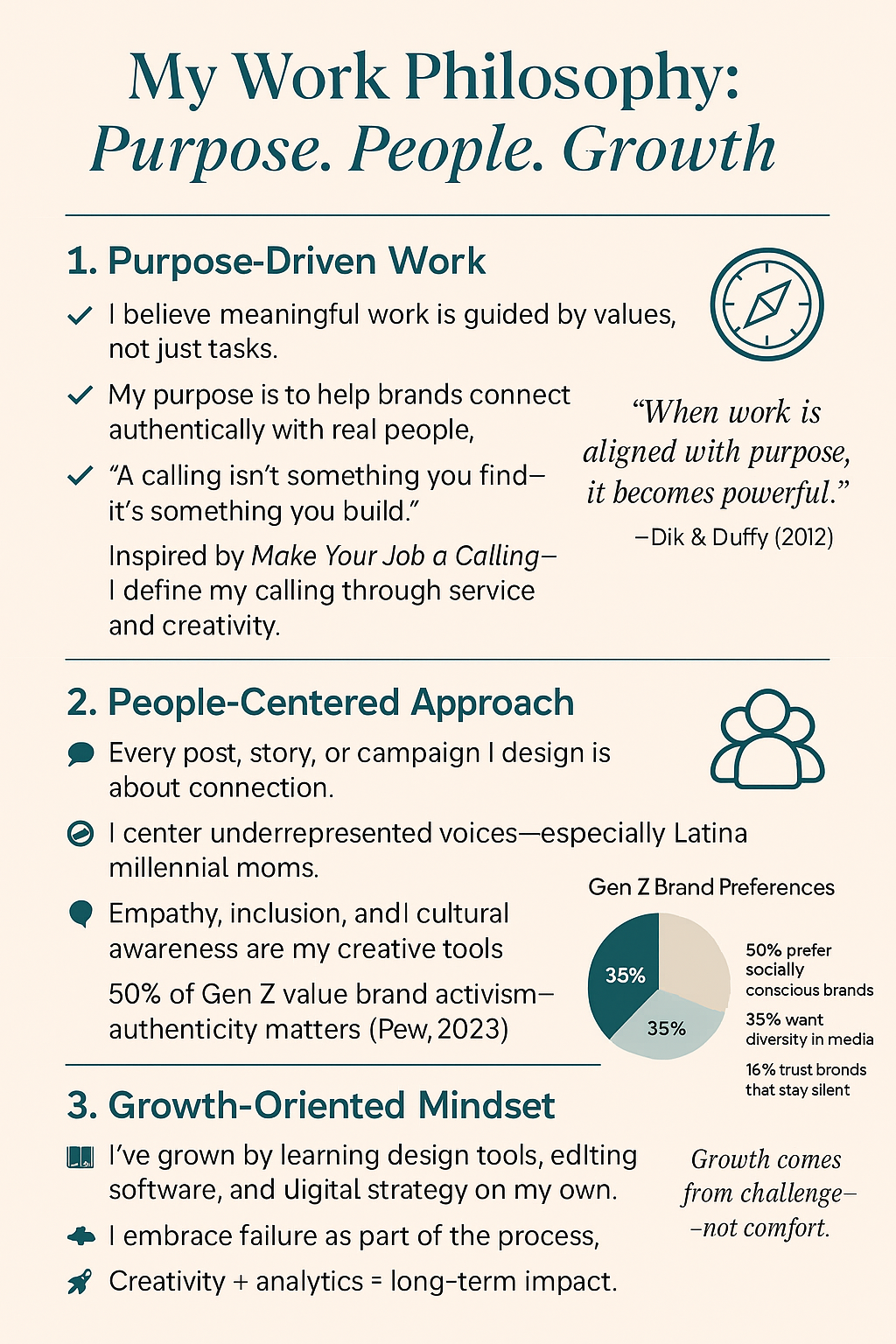 To me, meaningful work is purpose-driven, people-centered, and growth-oriented. As someone pursuing a career in social media management and digital content creation, I believe meaningful work is not just about producing results; it’s about creating impact. My purpose stems from helping brands authentically connect with diverse audiences while also staying true to my values of inclusivity, creativity, and continuous improvement. Reading Make Your Job a Calling by Bryan Dik and Ryan Duffy helped me realize that meaningful work begins with knowing who you are and using that knowledge to guide your actions with intentionality (Dik & Duffy, 2012).